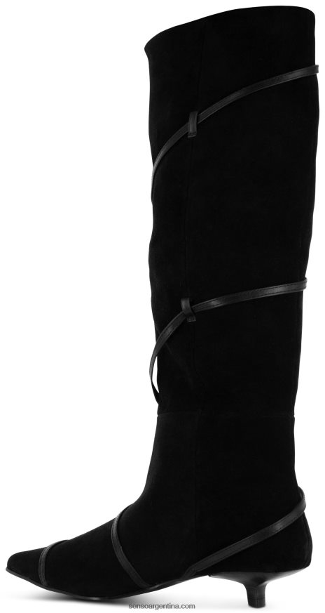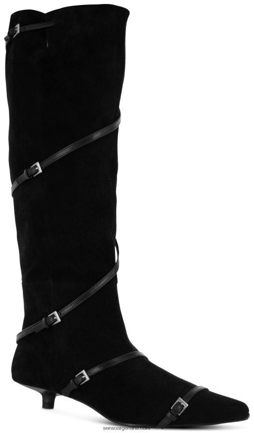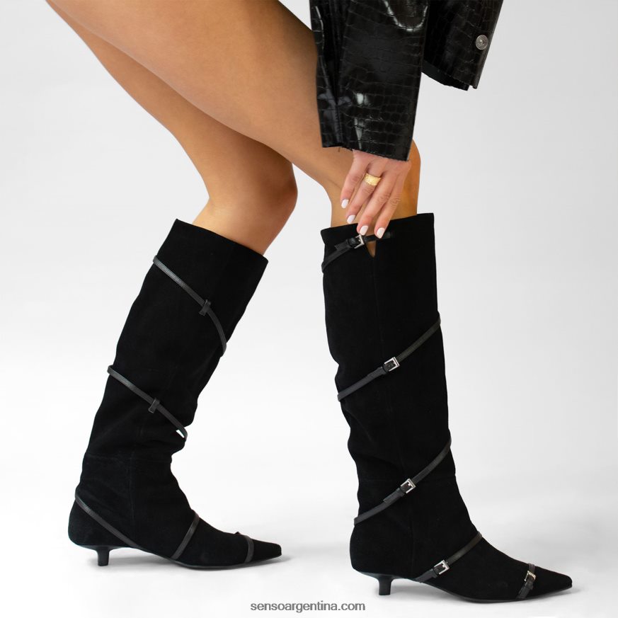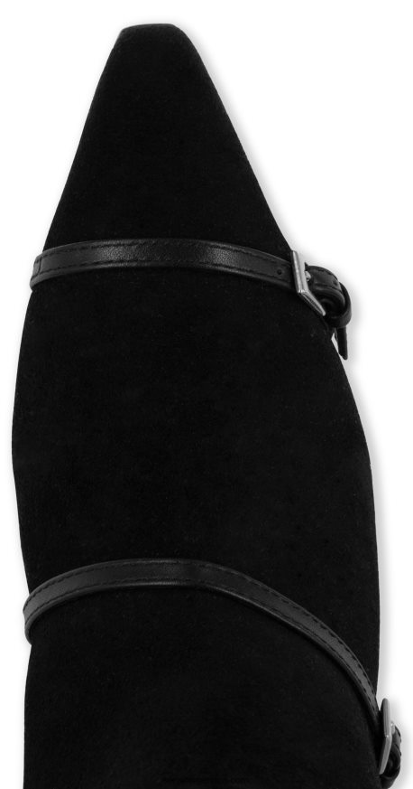Botas altas hasta la rodilla de ante de becerro color ébano, con tacón bajo y detalle de hebilla.