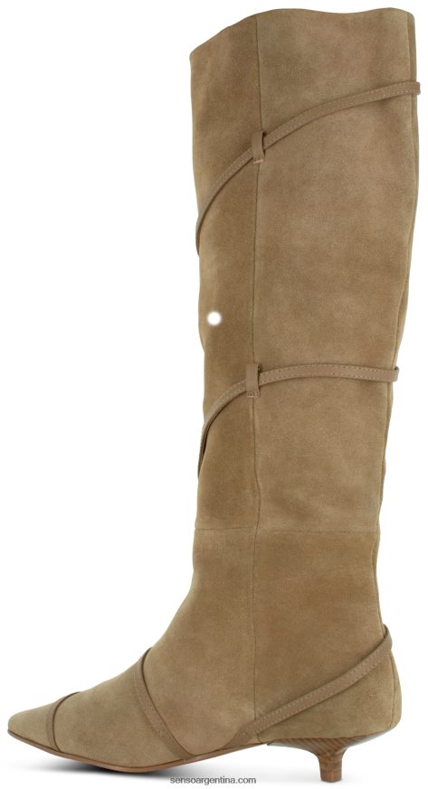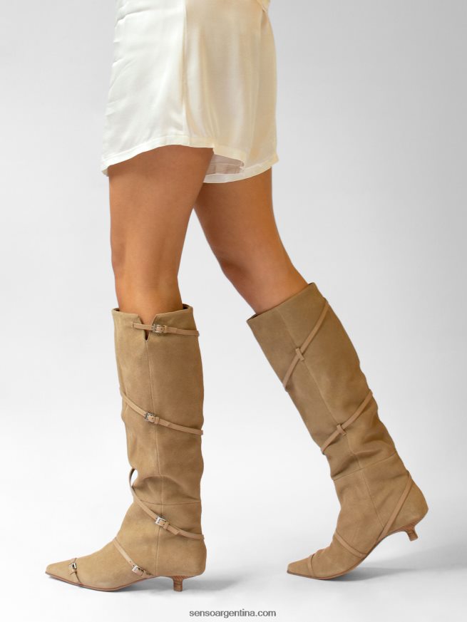 Botas altas hasta la rodilla de ante de becerro color almendra, con tacón mini y detalle de hebilla.