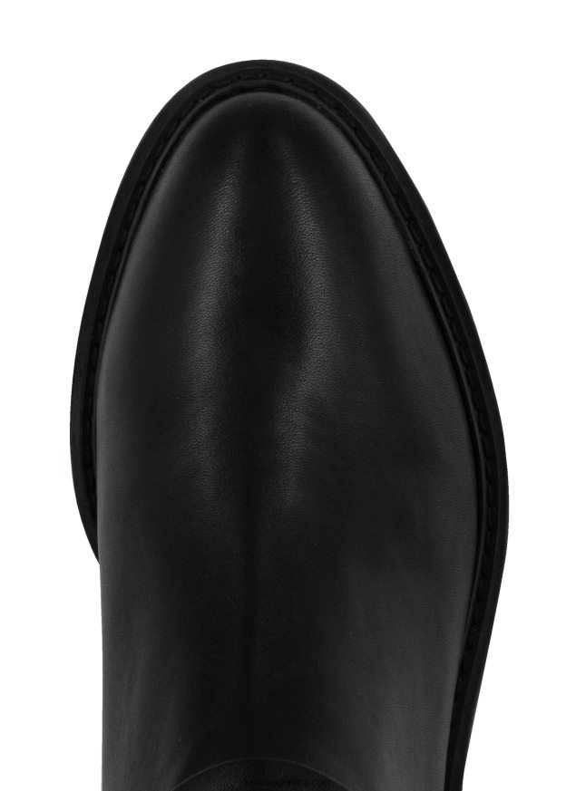 Bota alta hasta el muslo en piel de napa color ébano con detalles plateados y suela negra.