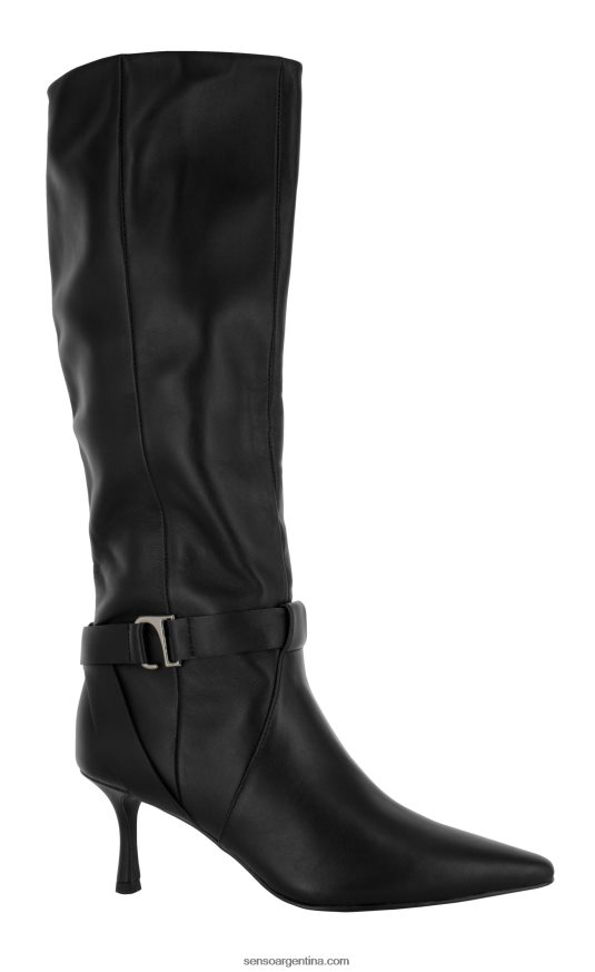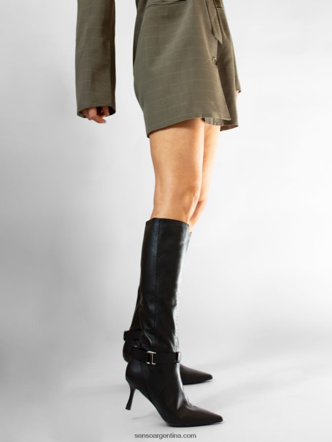 Botas altas hasta la rodilla de piel de becerro color ébano, con detalle de broche plateado, tacón de aguja y puntera en punta.