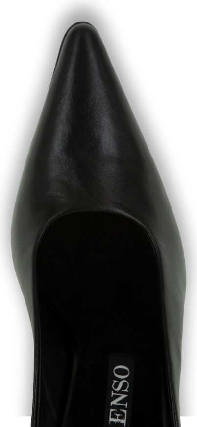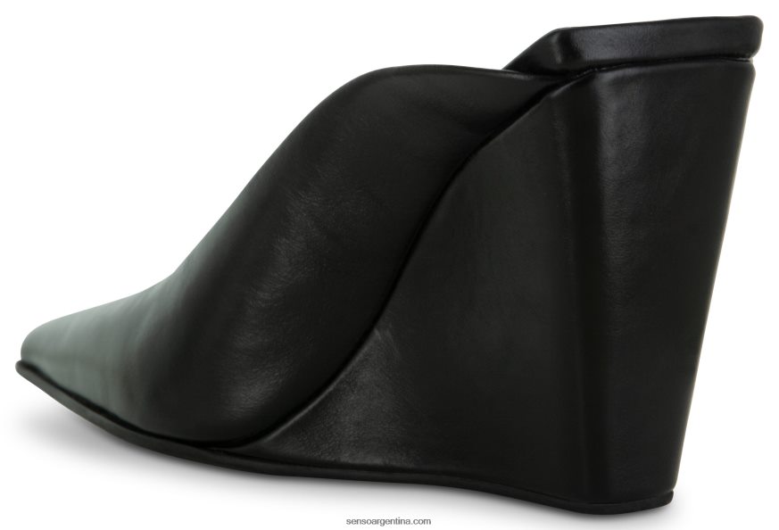 Zapatos mule con tacón en piel de becerro brillante color ébano, con puntera en punta, diseño sin cordones y tacón de cuña.