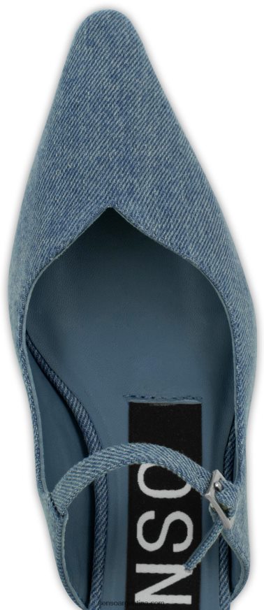 Zapato azul denim, cierre con hebilla lateral, estilo slip-on, puntera en punta y tacón bajo.