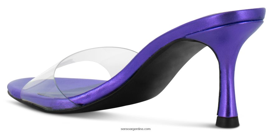 Zapatos de tacón de piel transparente de vinilo color uva con un diseño sin cordones, puntera en forma de almendra y tira delantera transparente y gruesa.