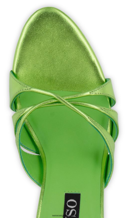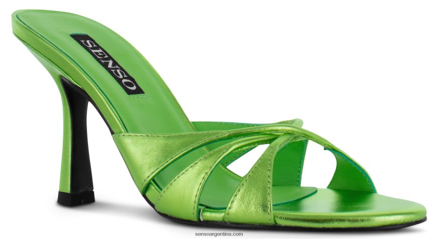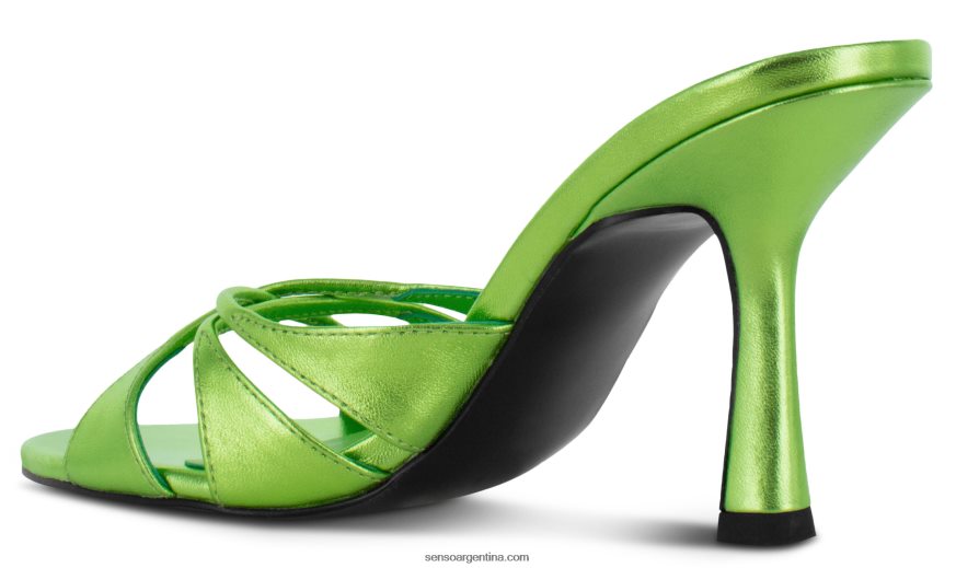 Sandalias de tacón en piel de cabrito metalizado Absinthe con triple tira cruzada, brillo metalizado y puntera en forma de almendra.
