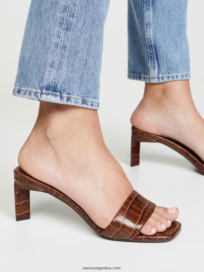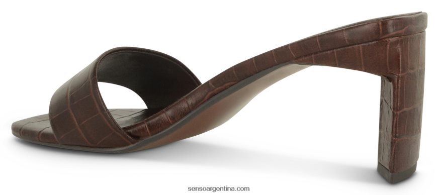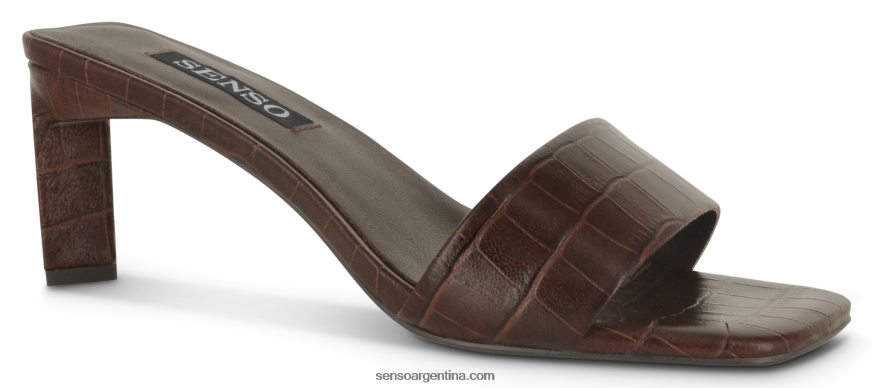 Zapato mule maisy i de piel marrón con puntera abierta, estilo slip-on, efecto cocodrilo en relieve, plantilla con logo y tacón alto.