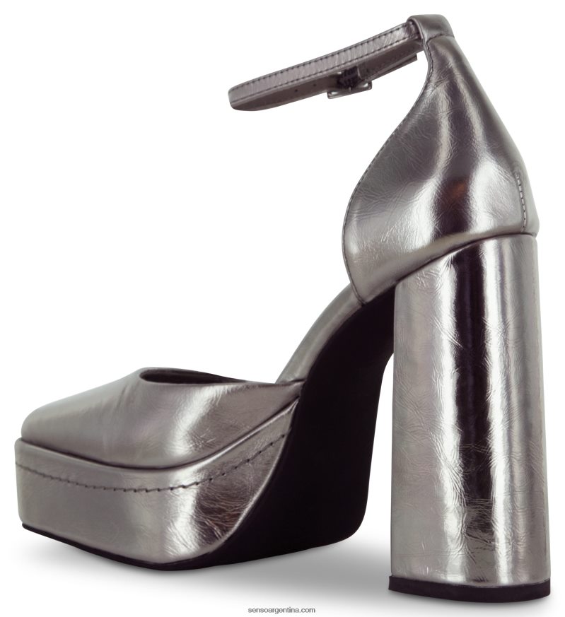 Zapatos de tacón con plataforma de naplack de acero cromado, con hebilla de metal, tacón de bloque y plantilla con la marca.