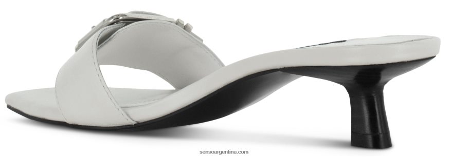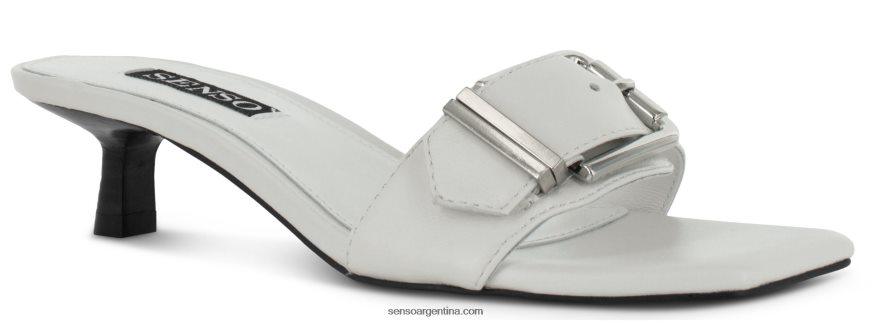 Sandalias de piel de cabrito mate mazapán con hebilla de metal brillante, sutil tacón bajo y puntera cuadrada.