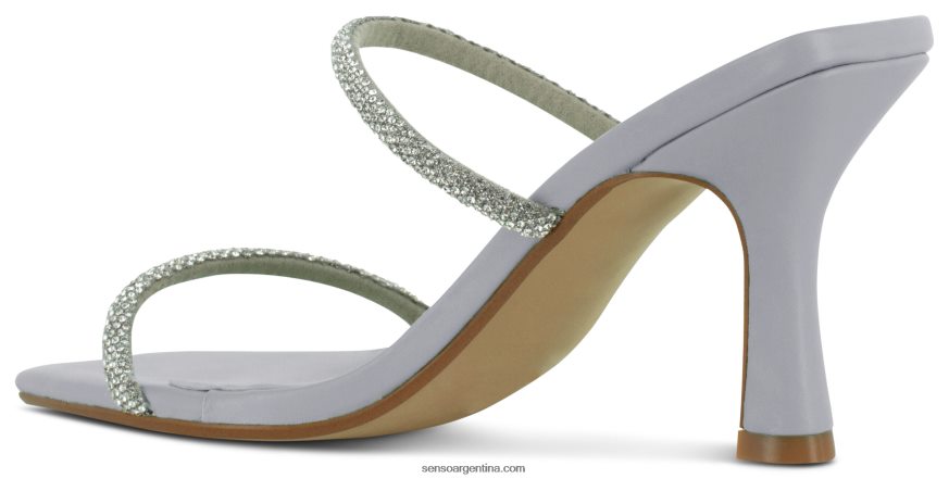 Zapatos de tacón de piel de cabrito color lavanda mate con puntera cuadrada abierta y tiras de cristal plateado.