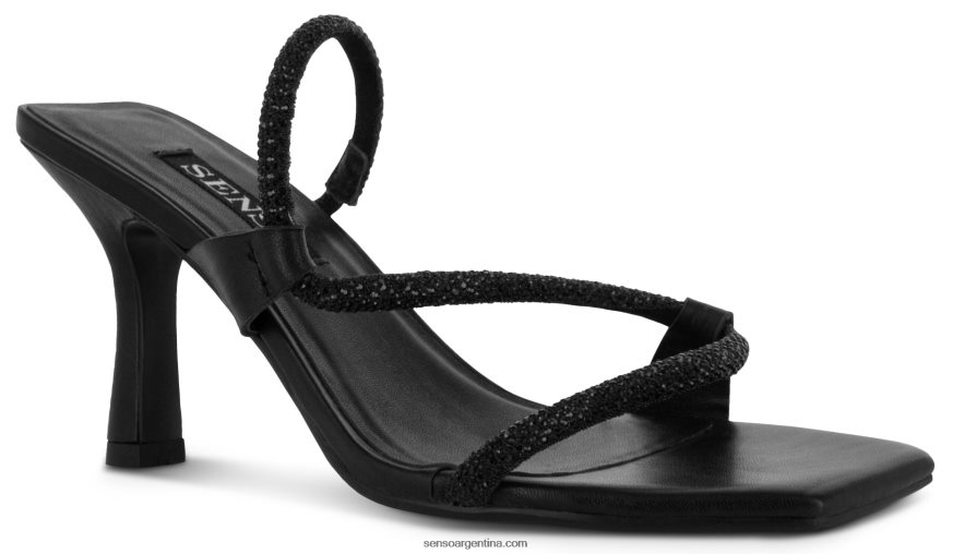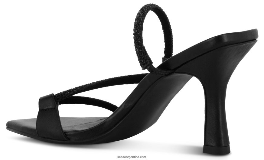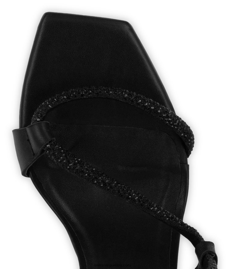 Zapatos de tacón de piel de becerro color ébano con correa de cristal plateado.