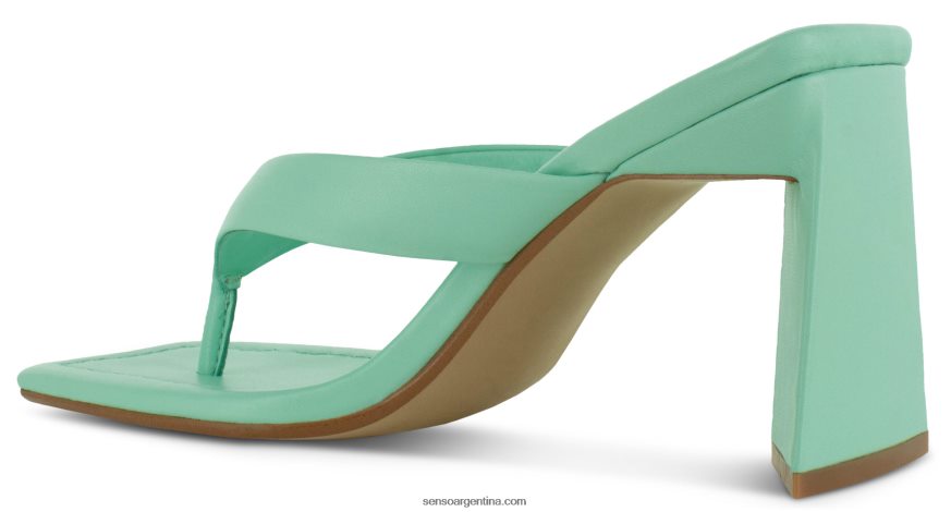 Zapatos de tacón de piel de cabritilla mate verde menta con un diseño sin cordones, detalle de correa de tira y tacón de bloque triangular.