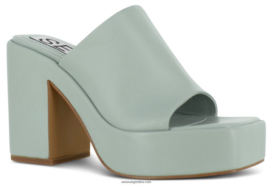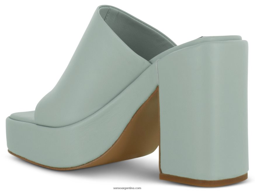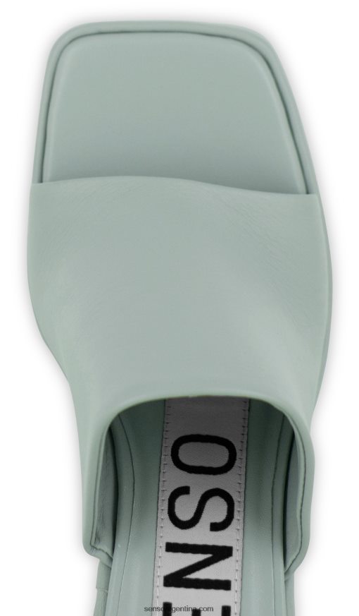 Zapatos mule con tacón en piel de niño color salvia mate con tacón grueso, correa delantera gruesa y diseño sin cordones.