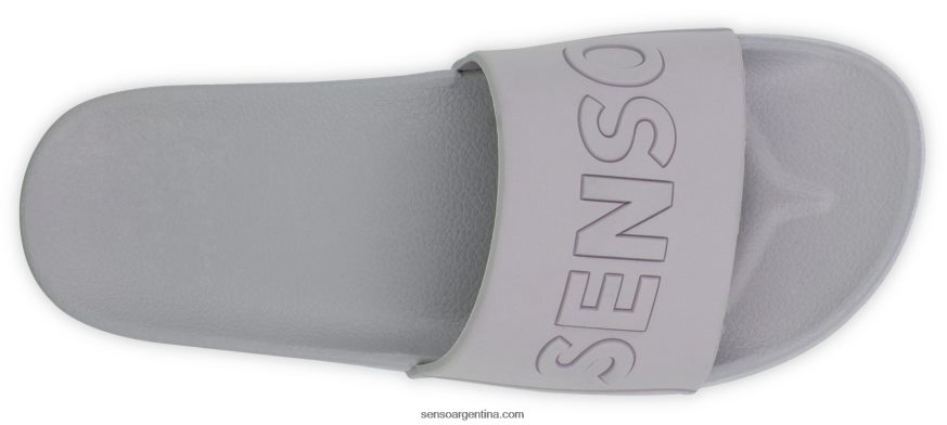 Zapatillas de goma lila con suela de goma mate y logo senso en relieve en la parte superior.