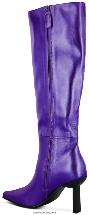 Botas altas hasta la rodilla de becerro metalizado, con tacón de aguja, puntera en punta y cremallera lateral completa.