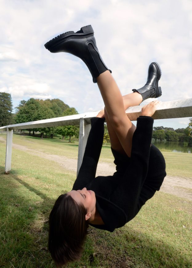Botas de becerro granulado de ébano, con suela de goma gruesa, laterales elásticos y puntera redondeada.